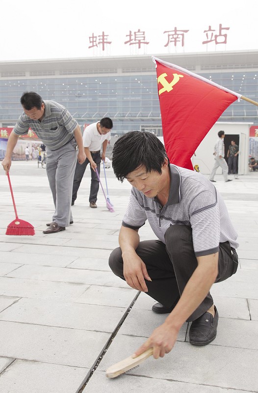 6月25日上午,為慶祝中國共產(chǎn)黨建黨90周年暨京滬高鐵開通,蚌投集團黨委組織集團本部及所屬19個子公司共計198名黨員去高鐵蚌埠南站義務(wù)勞動,清理南站廣場建筑垃圾并清掃地面,為高鐵通車做出一個黨員力所能及的貢獻。